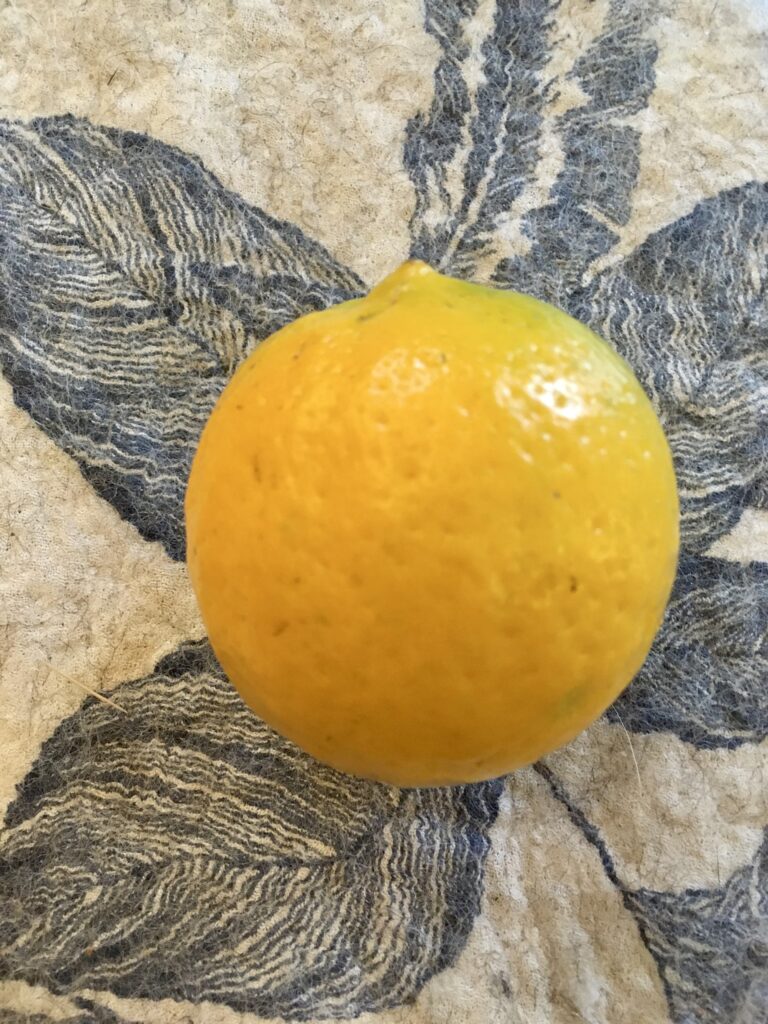 As we had such a warm Fall, the lemon tree has got a bit confused and is still producing! I took this one off a week or so ago.