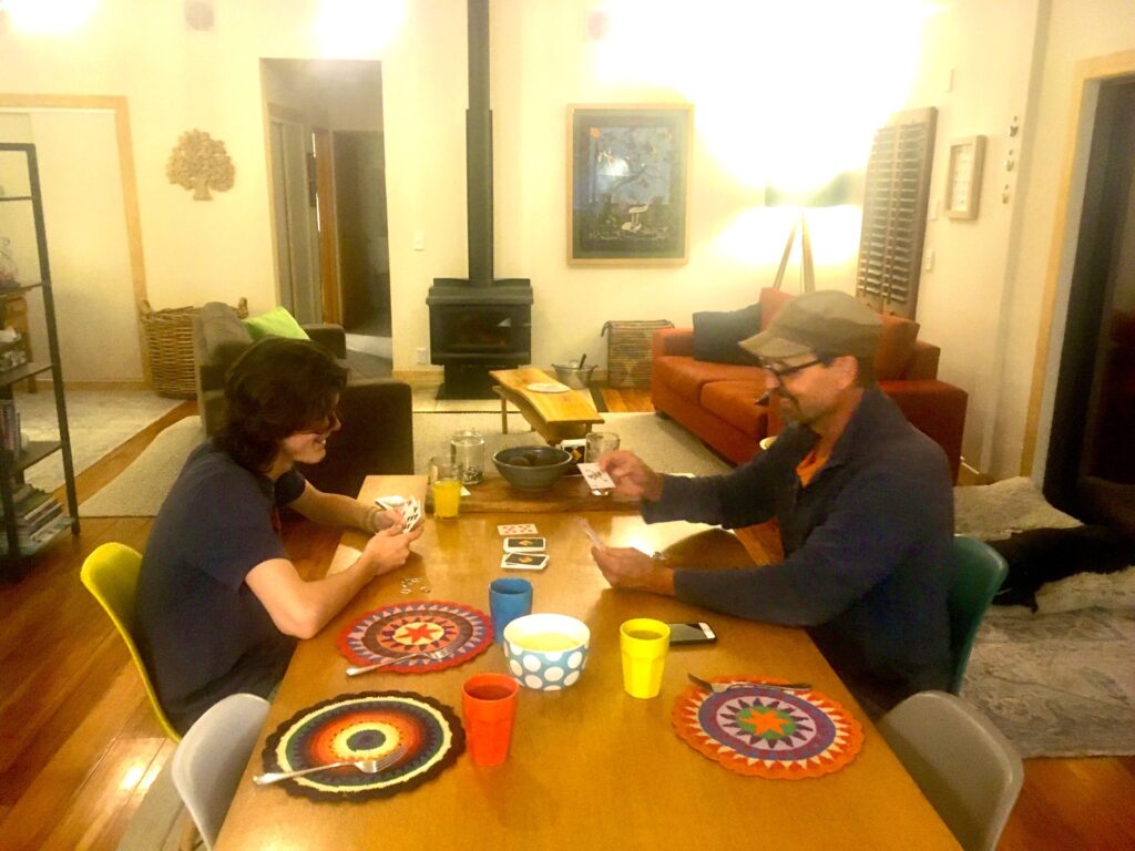 I had asked Rich to make a trip to one of my favorite shopping places on the Island to pick up some things that are ridiculously expensive here and much more reasonable there. It is known as Goats on the Roof, yes they literally have goats living on the roof. Anyway Rich brought home some playing cards, so a pre-supper game was must to christen them 🙂