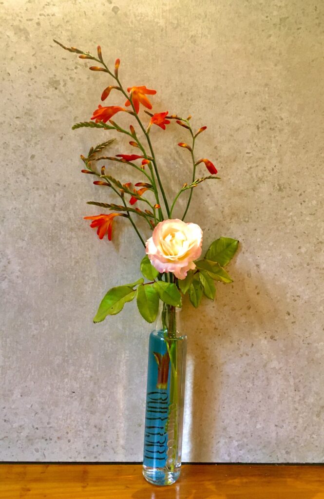 Flowers are in abundance everywhere; I dot them around the house in various vessels. This one a wine bottle that Rich brought me, I rather like it so am repurposing, (the wine I liked too 😉)